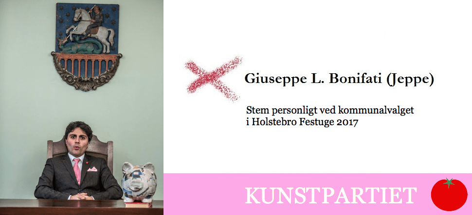 Under det kunstneriske ophold vil Giuseppe L. Bonifati og Linda Sugataghy gå fra dør-til-dør for at besøge borgere i Holstebro og tilbyde dem deres GRATIS tjenester og hjælp i forhold til månedens tema. Og i slutningen af hver måned vil der være en kollektiv forestilling relateret til det aktuelle tema, som involverer lokale foreninger, skoler og kulturelle institutioner. Den spanske kunstner ALBERTO M. GUINALDO er en permanent samarbejdspartner, og han vil deltage i disse månedlige events. Efter i 2015 at have helliget sig at lære det danske sprog og den danske kultur, vil projektet begynde med, at Jeppe opfører en ‘officiel tale’ til byens borgere. Motivationen bag dette interaktive projekt er at fejre 50-året for HOLSTEBROS KULTURELLE PROJEKT initieret i 1966 af byrådet i Holstebro med borgmester KAJ K. NIELSEN og kommunaldirektør JENS JOHANSEN i spidsen, samme år som Maren og Odin Teatret slog sig ned i byen, og Kunstmuseet og Musikskolen begyndte deres aktiviteter. Denne motivation er præsenteret i det forpligtende postkort fra Kaj. K. Nielsen og Jens Johansen og sendt til Jeppe med opfordring til ham om at realisere dette nye projekt. Navnet på ‘Borgmester Jeppes’ parti er KUNSTPARTIET, og det henvender sig til danskere og ikke-danskere, kunstnere og ikke-kunstnere, beboere og ikke-beboere. Kunstpartiets mål er STRÆBEN EFTER SKØNHED GENNEM KUNSTEN. Aktiviteterne vil slutte under Holstebro Festuge længe før den rigtige kommunale valgkampagne 2017 begynder.
